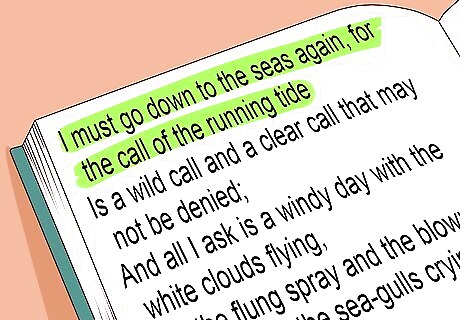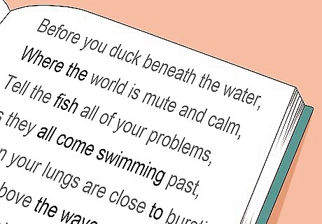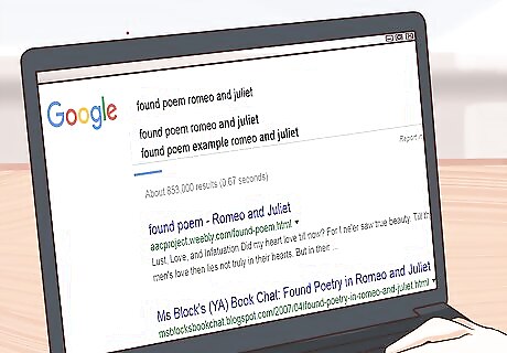 Read examples of found poems. Oftentimes, a poet can be inspired by the works of other writers.Read some good examples of found poem to get an idea of how words from original texts can be selected and rearranged in order to create a found poem. Search for found poems based on works you are familiar with. For example, you could go to Google and type “found poem Romeo and Juliet” to find examples of poems using excerpts of words and phrases from that literary work. Check out a website devoted to found poetry. A good start would be the website The Found Poetry Review. It provides numerous volumes of found poems written by many authors.