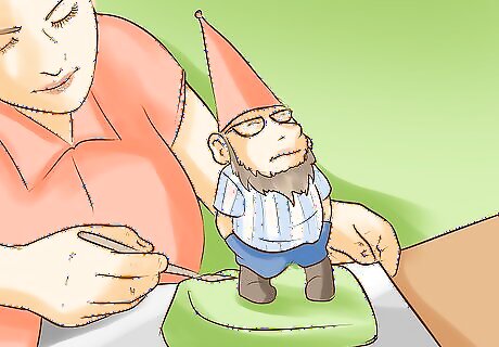 Search for mini-replicas of your husband’s distinct characteristics or items. Look around the house for shirts, glasses, beard materials or other items that are free to be used and could be cut down to size to accommodate the gnome's size. For example, a shirt could be cut down to size and restitched into gnome size, while oversized glasses would still work as a caricature effect. If you have children, look through their doll clothing, typically something that may fit an American Girl Doll or even a baby doll. You might need to dye the colors or change the outfit a bit to work; think laterally. If you craft things, it's likely that you'll have the items or the materials to create accessories such as a beard, hair or glasses. Anything used for making dolls, decorations or miniatures will likely be of use. Visit local retailers to purchase appropriate clothing or accessories for the garden gnome that you couldn't rummage up at home. With list of items you still need in hand, hit the local toy store first to see if they have any of the standard clothing or features. If you cannot complete your purchase at the toy store, the hobby and/or craft store should be your next stop. And even stores that stock items for cake decorating may be useful for miniatures such as bottles and sporting gear.