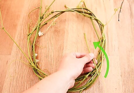 Pull the strand through to the inside of the ring. This will help you to anchor the wreath together. It can sometimes take several attempts to do this. Once the ring is secure, start wrapping the vine around the wreath in a spiral. Continue spiraling until you get to the end of the vine. Tuck the loose ends into the body of the wreath. Because the vines are stiff, you probably won’t need to hold the circle together with string or wire.
