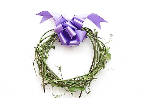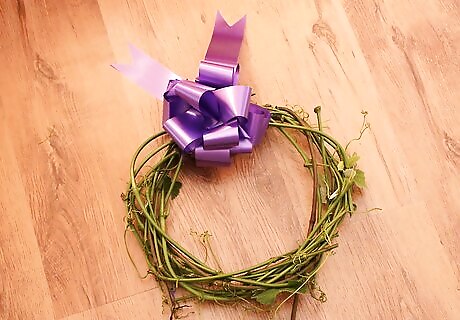 Hang the grapevine wreath. Now that you've finished your project, it's time to hang the wreath. First, choose the spot where you want to hang it. You can hang a grapevine wreath on a door or wall or outside on an arbor. It's easy to hang the wreath. Simply hook one of the top grapevines on a nail. You could also loop a piece of wire through one of the top vines. Twist the pieces of wire together, and then hang that onto the nail. You could also use a glue gun to glue a ribbon loop to the top of the wreath.