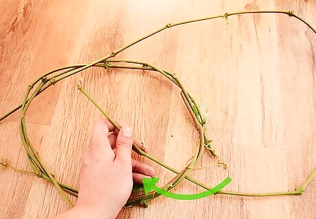 Loop the vines into a circle. It will be easier to shape the grapevines if you use them right away after collecting them. Basically, taking a few of the thick vine strands, wind them around into a circular shape. Make the first ring the size you want the wreath to be in the end, perhaps about 30 inches across. The first ring is the most important for this reason. Hold the thicker end of a strand in one hand, and loop the vine around in a circle as if you were winding up a garden hose.