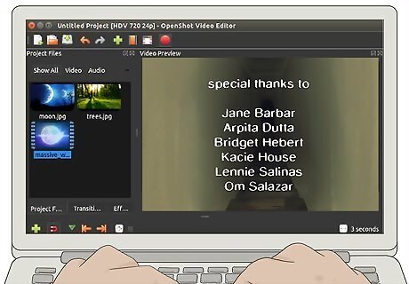 Create the title and credits sequences. You'll want to name your cast and crew at the end of the film. You can also include a list of "thank yous” to any organizations that were willing to let you shoot in their establishments. Most importantly keep it simple.