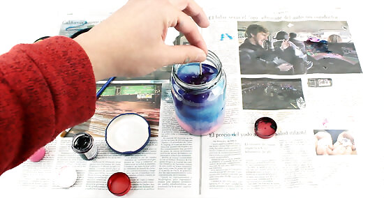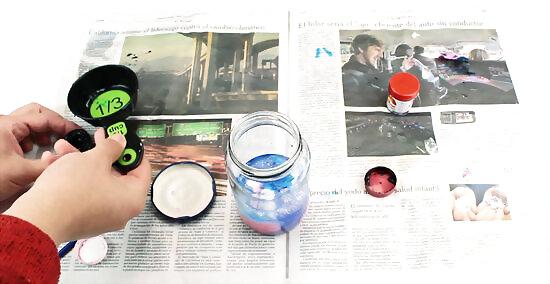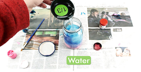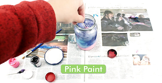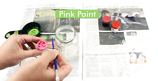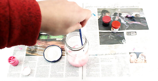 Put in a few drops of pink paint. Put the lid on and shake the jar until the paint is blended with the water.