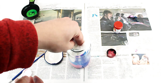 Stretch out some more cotton balls. Push them down carefully until they fill up the paint water. Let the cotton balls soak up the water.