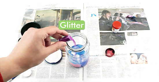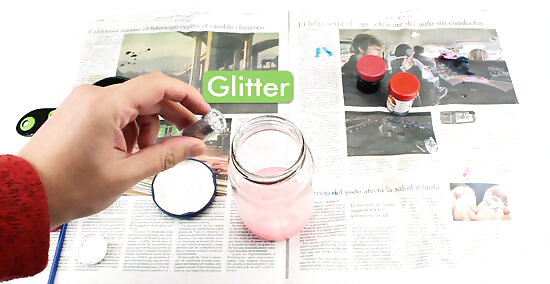 Remove the lid and add some glitter (about a teaspoon).