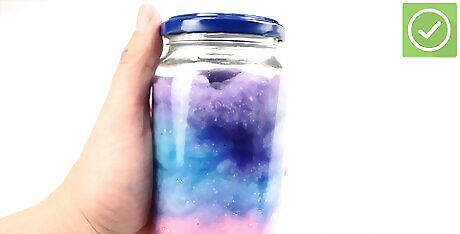 Add a few drops of pink, stretch the cotton balls and push them to the glass instead of down (only if purple is desired). If purple isn't desired repeat step 10 with pink and don't push the cotton outwards. Add glitter.