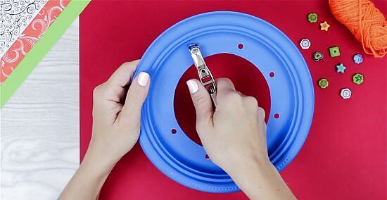 Using a hole punch and make holes all around the edge of the plate, in the rim. Make them evenly spaced or punch holes at random.