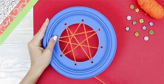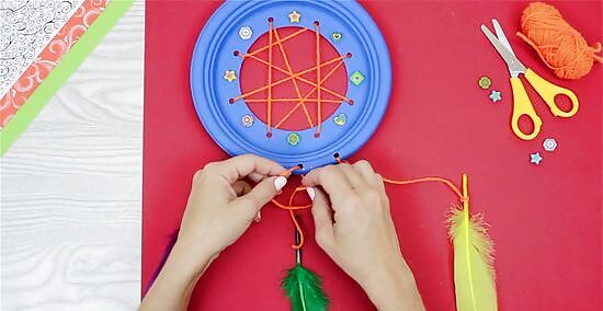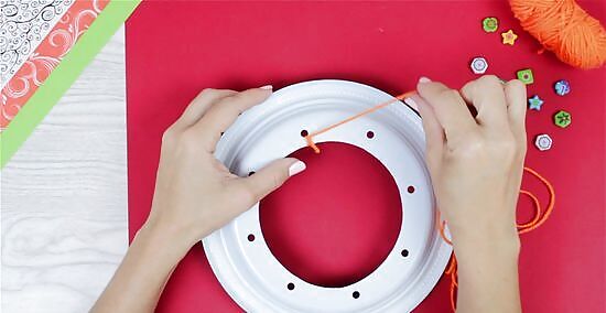 Thread one end of your yarn through one of the holes in your paper plate and tie it in a knot so it stays in place.
