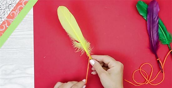 Decorate your dream catcher with feathers. Every dreamcatcher has to have feathers! Three is a good amount but you can use more or less. The feathers will hang off your dream catcher on more yarn of thread. If you are using a large plate cut two, four-inch pieces of yarn or thread and one six-inch length. If you are using a mini plate cut two, two-inch pieces and one four-inch piece.