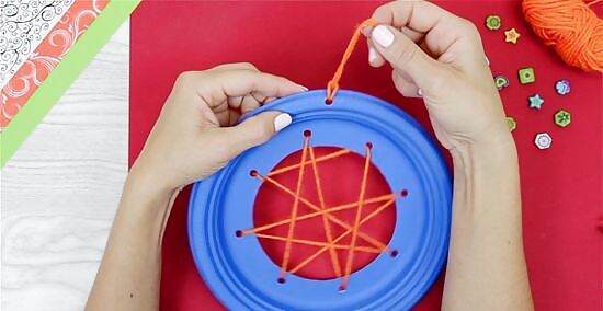 Thread this yarn or string through each hole. If you're struggling to thread six feet of yarn through a tiny hole time after time, cut the yarn into manageable lengths. You can start threading your lengths of yarn at any point around the rim of the plate. Don't put too much tension on the yarn, the paper plate won't stay a neat circle if your threads are too tight.
