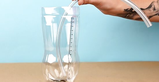 Insert clean tubing. The tubing should stop just above the bottom of the bottle. Tape it in place straight against the ruler. It's best to tape the tubing above the water, since tape covered by water may loosen and fall off. You will probably need about 40 centimetres (16 in) of tubing to be able to stick up out of the top of the bottle. If your tubing isn't long enough, cut the sides of the bottle so they are lower. Leave some of the tubing hanging loose.