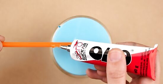 Glue the straw on top of the jar. If your straw has a bent end, go ahead and cut that off first. Place a small amount of glue on one end of the straw, and place it so that the end touches the middle of the balloon. The rest of the straw should hang over the edge of the jar. This straw will serve to hold the pointer, allowing you to track changes in atmospheric pressure. Silicon glue will work well. You can use super glue, craft glue, or even a glue stick in a pinch, however. Make sure to let the glue dry before you move on. The longer the straw, the better (as long as it is a straight one). You can even insert the end of one straw into another to make one longer straw.