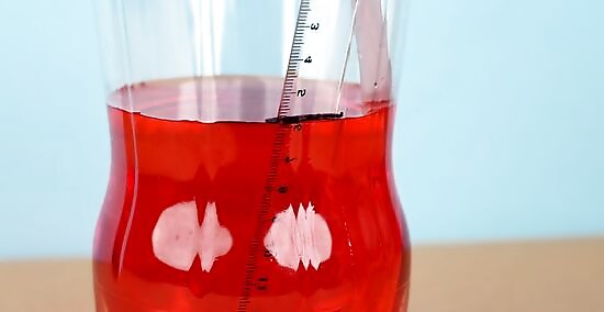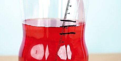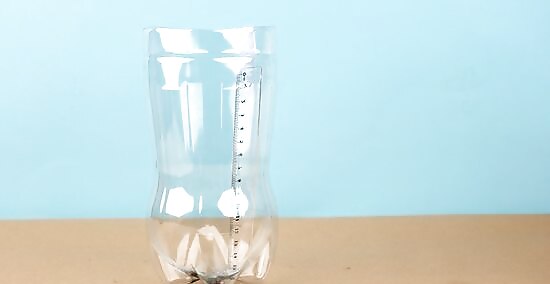 Set a ruler inside the bottle. It should stand up inside, flat against the side of the bottle. Put a piece of tape over the outside of the bottle and part of the ruler to hold everything in place. You should be able to see the numbers on the ruler.
