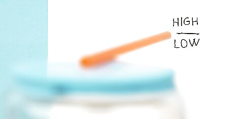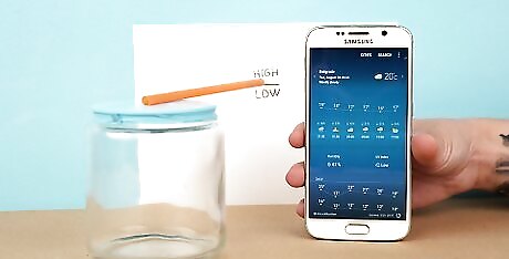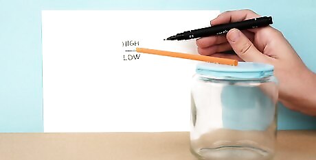 Stand some stiff paper next to the pointer. To make things nice and easy, tape a sheet of paper to a wall, and place the jar next to it so that the pointer aims at the paper. Mark the pointer’s position on the paper. Above it, write “high.” Below it, write “low.” Stiff paper like cardstock or cardboard will stand up better, but you can use regular paper if that's all you have. You can find lots of options at any store that sells stationery or office/school supplies. The pointer should be close to the paper, but not actually touching it.