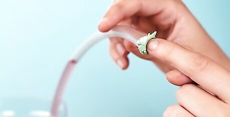 Suck some of the water into the tube. Use the end of the loose tubing like a straw, and gently suck some of the water up. You’ll want the water to rise about halfway up. Since the water is colored, it should be fairly easy to see. Place your tongue over the end of the tubing when the water is in place, to hold the suction and keep the water from going back down. Be careful not to suck the water all the way up!