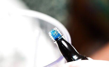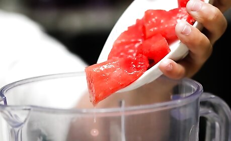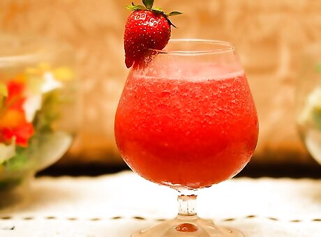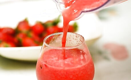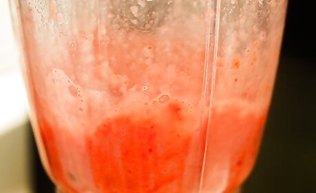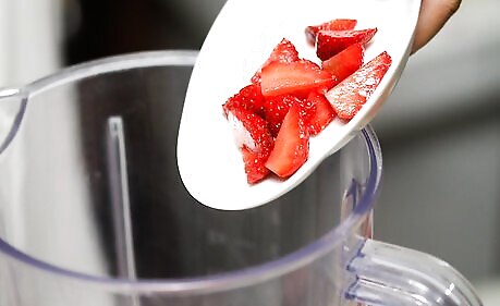 Hull the strawberries (take the tops off) and cut them into slices. Add the pieces to the blender.