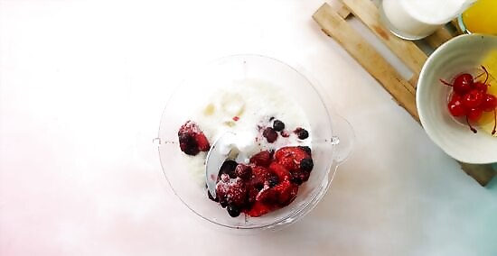 Add the berries. You can use strawberries, blueberries, blackberries, or a combination of all three! Blend the berries with the creamy base to create a colorful drink.