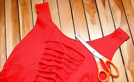 Sew your more complicated design ideas. If you know how to sew, (or have a friend or relative who might help), consider reworking or even combining different items from your wardrobe. For example, you might: swap the sleeves of two different long-sleeved shirts to create a two-color effect; cut off and sew the collar of a collared shirt into the collar of a closed-neck shirt to fake a layered look; cut and sew a shirt with a torn armpit into a vest; invert a cheap hoodie and turn it into fuzzy mittens; cut out a long strip of an interesting fabric to make a belt, hip sash, or scarf; etc.
