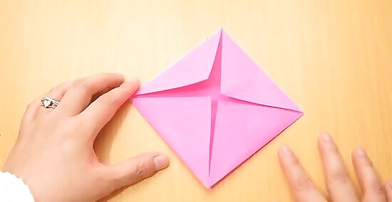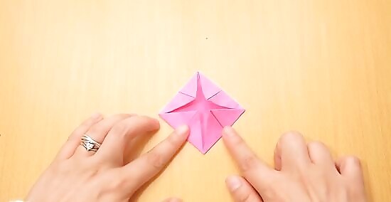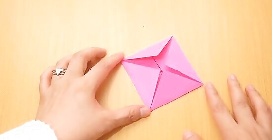 Flip it back over to the front (you should be able to see the pointy tips of the flaps from the previous step sticking out at the sides). Unfold the flaps from the center to the corners.