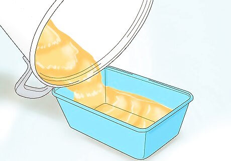 Pour the melted wax into plastic containers. With oven mitts still on, pick up the pot and gently tip it to pour the wax into 1 or more plastic containers. Use plastic containers with lids, such as a resealable plastic container for storing food. Pour slowly and fill each container about 2/3 to 3/4 of the way full. You may also leave the wax and water in the pot that you heated them in, but it may take longer for them to cool than if you transfer them to a few smaller plastic containers.