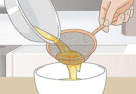 Pour the wax through a fine colander and into a bowl. To filter the wax, you will need a finer filter than the cheesecloth you used to separate it from the debris inside of the honeycomb. Place a mesh colander over a bowl. Then, slowly pour the melted wax into the colander. You can also try using reusable mesh coffee filter to filter the wax. However, the wax might make coffee filter unusable, so don’t use one that goes with your coffee maker. You may have to filter a small amount of wax at a time depending on the size of your colander. Go slowly to avoid overfilling the colander.