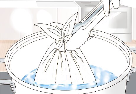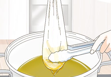 Use tongs to set the cheesecloth down gently in the pot of water. Use a pair of metal tongs to gently set the bundle of honeycombs into the pot. Don’t drop it into the water or the hot water may splash on you and burn you. Set it down in the water gently and use the tongs to push the bundle under the water fully if needed. Make sure that your tongs are made from metal or another heat-proof material. Do not use plastic tongs to set the beeswax bundle in the water.