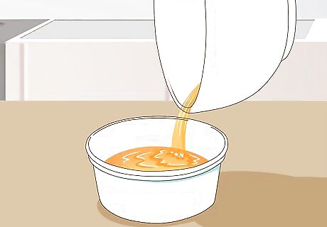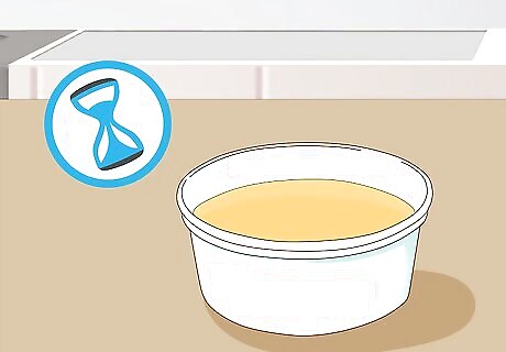 Let the wax cool for 2 to 3 hours. After transferring the wax into individual containers, allow it to cool at room temperature. The wax will harden and change from a translucent brown color to an opaque yellow as it dries. Avoid placing the wax into the refrigerator or freezer to speed the cooling process. It may harden more quickly, but this also increases the amount of air bubbles in the wax.
