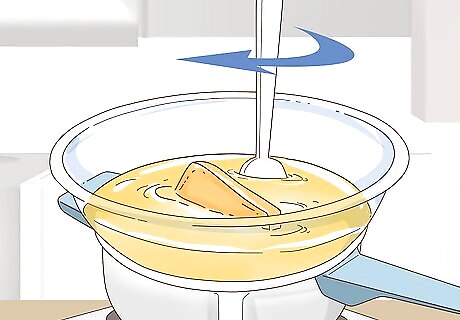 Heat the solid wax in a double boiler to melt it. Place a heat-safe glass bowl on top of a metal pot filled with about 2 to 3 in (5.1 to 7.6 cm) of water. Then, turn the burner on low. Place the solid wax into the bowl and stir it occasionally as it melts. Turn off the heat once the wax has melted completely. A solid piece of wax will take around 10 to 20 minutes to melt, depending on its size.