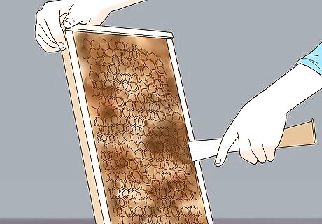 Scrape honeycombs out of beehive frames. If you have some old honeycombs in beehive frames, then you can use a scraping tool to remove them from the frames. Press down on 1 edge of the frame to pry out the honeycombs and repeat until it all comes out. If the honeycombs come out in large chunks, use the scraper to break them up into smaller pieces. This will make it easier for them to fit into your pot.