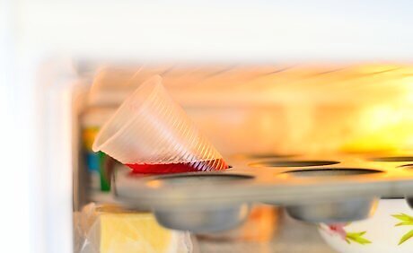 Add some of the white gelatin to each glass and chill again. When the first red layer is partially set, spoon some of the white gelatin mixture into the glasses over the red. Again, aim to place about 2 teaspoons (10 ml) of the white gelatin in each glass. Place the muffin tin back in the fridge for 20 minutes so the white gelatin can partially set.