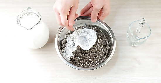 Stir the mixture again to break up any clumps of seeds. Use a spoon to give the pudding a final stir. You want to break up any clumps that are stuck together before you refrigerate the pudding so that it has an even consistency. You should still stir the pudding with a spoon if you are using a mason jar so that you break up any clumps with the edges of the spoon.