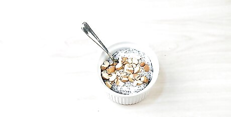 Sprinkle nuts on top of the basic pudding for more flavor and protein. Add 1/4 cup of nuts (37.5 g) of the nuts of your choice on top of the pudding right before serving. Nuts are a good source of protein and will add a crunch to the pudding. Try almonds, walnuts, peanuts, cashews, or a mixture of several types of nuts.