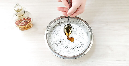 Stir in vanilla extract and sweetener and mix everything together. Put ⁄2 tsp (2.5 ml) of vanilla extract and 1 US tbsp (15 ml) of honey, maple syrup, or any other sweetener of your choice into the bowl or mason jar. Stir the milk, chia seeds, vanilla, and sweetener together thoroughly with a spoon. You can skip the sweetener if you want to cut down on sugar. If you are using a mason jar put the lid on and shake all the ingredients together instead of stirring them.