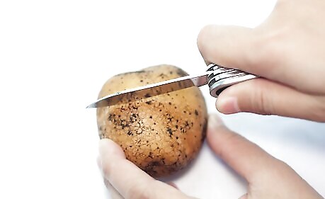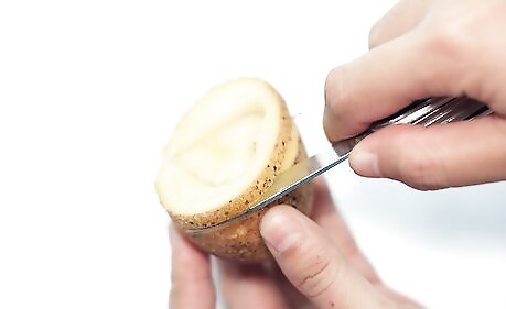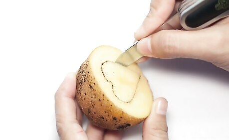 Have an adult use a sharp knife to cut straight down into the potato along the lines of your drawing (about 1/4 inch deep.)