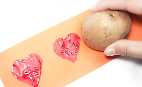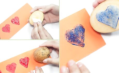 Barely touch the "stamp" (in this case the heart) to the paint and then carefully put the stamp onto the article you wish to decorate (T-shirt, Paper, Gift Wrap, etc.) Don't use too much paint and don't move the stamp from side to side - press down and lift straight up, carefully.