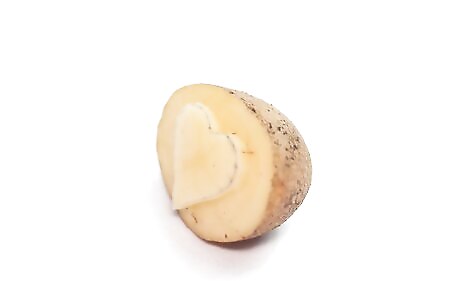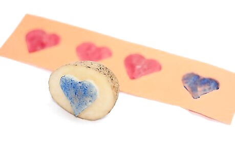 Again, with an adult, use the sharp knife to carefully cut away the potato from the sides (about 1/4 from the top edge) inward, up to the lines where you drew your picture and cut into the potato. This should leave a heart in the middle of the flat, cut end of the potato that sticks up above the part you removed with the knife.