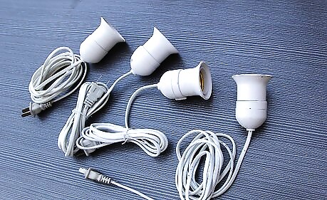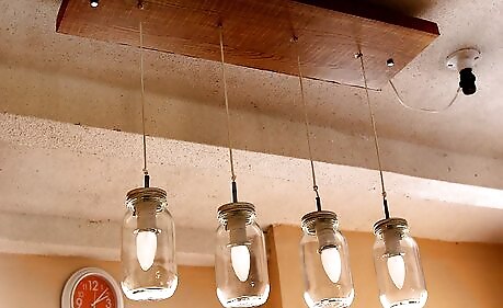 Buy a lighting kit. The number of kits depends on how many jars you will use. Cut the ends where the plugs are.Make DIY Mason Jar Chandelier Step 10Bullet1.jpg Insert the wires through the jar lids.Make DIY Mason Jar Chandelier Step 10Bullet2.jpg You can secure the lighting kit by applying strong adhesive on it or simply tie the wire into a knot.Make DIY Mason Jar Chandelier Step 10Bullet3.jpg