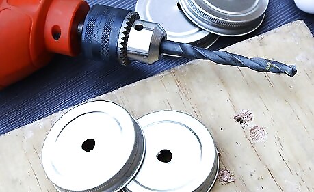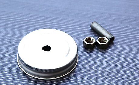 Obtain a metal tube where the electrical wire can pass through the jar lids. Use whatever is more accessible to you, you can use an old lampshade holder. cut them into pieces and use a nut to lock them in place. Apply adhesive on the cap.Make DIY Mason Jar Chandelier Step 9Bullet1.jpg Insert the metal tube on the hole on top of the cap.Make DIY Mason Jar Chandelier Step 9Bullet2.jpg Thread the nut on the tube and stick it on the cap with adhesive.Make DIY Mason Jar Chandelier Step 9Bullet3.jpg