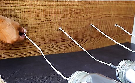 Insert the wires through the holes you made. Tie the wires into a knot on the other side of the plank, this will help the jars securely suspended.Make DIY Mason Jar Chandelier Step 14Bullet1.jpg