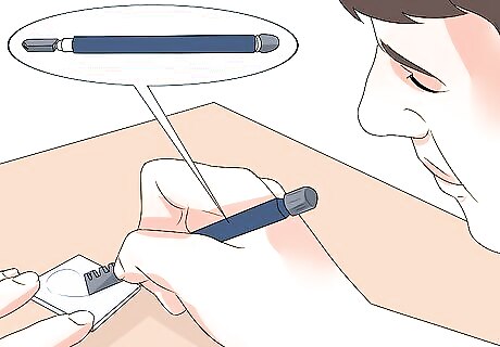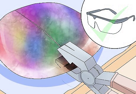 Apply even pressure as you make a firm, clean cut. Hold your glass cutter like a pen and cut a straight line onto your glass. Cut towards you if you are making straight lines. Cut away from you if you are cutting curved lines. Snap straight cuts by using breaking pliers. Alternatively, you can hold the piece of glass at either side of the cut you’ve made and snap the glass apart that way too. Tap curved cuts at the back of the glass along the score line until it begins to break.