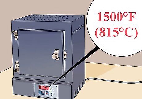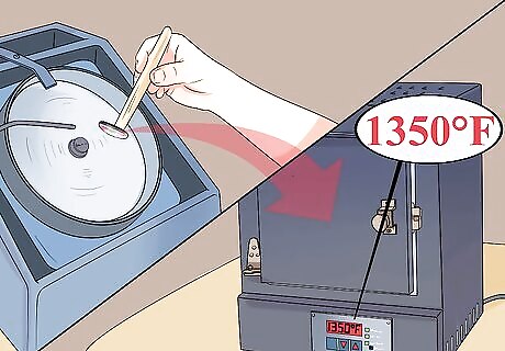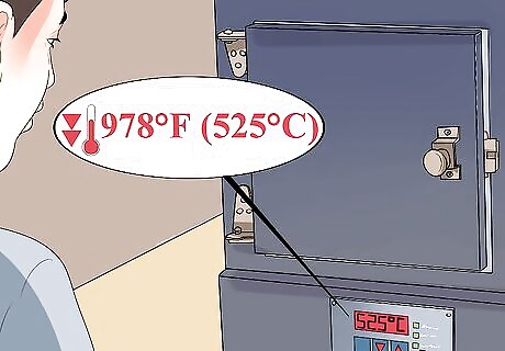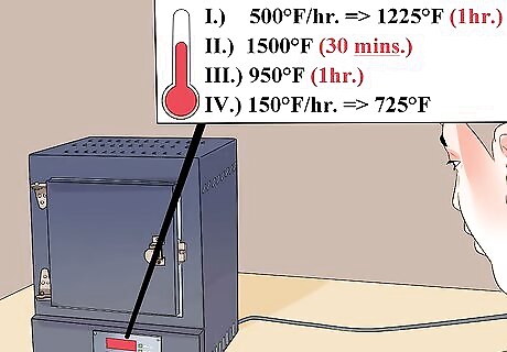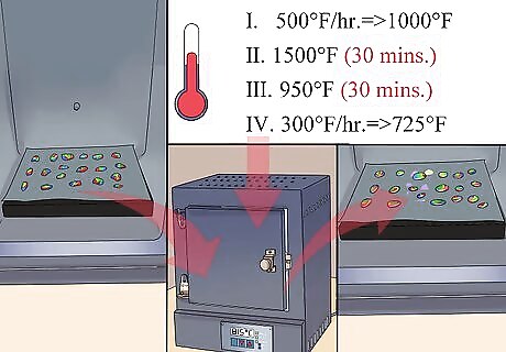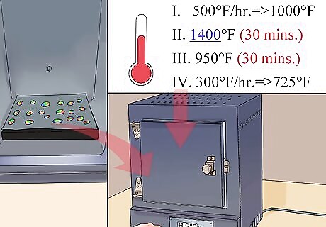 Set the temperature on the kiln. If you’re using a manual kiln, set the temperature to medium for about 15 minutes. Bring up to 1500°F (815°C) per hour and hold for 10 minutes. If using a programmable kiln, ramp your temperature up to 1500°F per hour and hold for 10 minutes. Check that your cabochons have fully fused. If not, let the temperature return to 1500°F and hold for another 5 minutes. Once the glass has fully fused, turn the kiln off and open the door until the temperature reaches 1000°F (540°C). Close the door. Repeat until the temperature is stable at 1000°F.