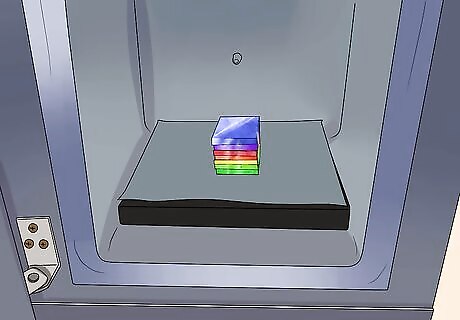Gather your glass pieces together. Place a stack of seven 1/8” thick layers of 3x3” glass in your kiln. If you are fusing together two stacks of glass in your kiln at a time, make sure that you leave enough empty space around them in the kiln so that the glass pieces can spread easily as they melt to fuse together.