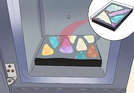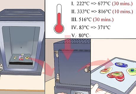 Fire the kiln using a firing schedule. The firing schedule will be broken up into four different segments where you will adjust and hold the temperature for a specified amount of time to heat the layers. Avoid thermal shock by slowing the ramp of the first segment for firing layers bigger than 3x3” in size. For the first segment, fire the layers at a ramp of 500 degrees per hour with a target of 1225 degrees Fahrenheit. Hold that temperature for an hour. For the second segment, fire the layers on a full ramp with a target of 1500 degrees and hold that temperature for 30 minutes. For the third segment, fire the layers again on a full ramp with a new target temperature of 950 degrees Fahrenheit for an hour. For the fourth and last segment, fire the layers on a ramp of 150 degrees Fahrenheit per hour with a target of 725 degrees. This is a quick firing so don’t bother holding it for any allotted amount of time. Meet the target temperature and turn the kiln off.