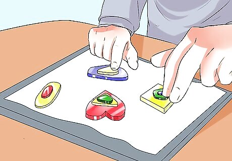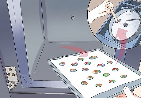 Assemble pieces together to prepare them for the kiln. Create designs with 2-3 layers of 1.6 mm thick glass, either all different colors or in a pattern. Place them onto the kiln about 10 mm apart so that they can spread without interfering with the other fusing glasses on the kiln. Add small amounts of the PVA/water mix (half PVA glue, half water) to the glass to help them stick together and to prevent displacement when you move them around. Make sure that the glue is dried completely before you turn on the kiln to begin firing the pieces. Consider the location of the glass pieces you place on the kiln. For example, if you want squarer cabochons, position the glass closer to the front where the kiln is cooler.