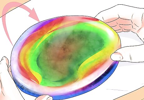 Mold the jagged pieces into puddles. Heat is necessary to create cabochons into the round, non faceted stones, or puddles, that this method calls for. Firing it in the kiln again is necessary. Arrange the chunks onto the kiln, a few inches apart, as you would cookie dough on a baking sheet. For the first segment, fire the puddles at a ramp of 500 degrees Fahrenheit an hour with a target of 1000 degrees Fahrenheit. Do not hold it for any amount of time, just do a rapid fire and heat it quickly until it reaches its target temp. For the second segment, fire the puddles at a full ramp with a target of 1500 degrees Fahrenheit. Hold it for 30 minutes. For the third segment, fire the puddles at full ramp again with a new target of 950 degrees Fahrenheit. Hold it for 30 minutes. For the fourth segment, fire the puddles at 300 degrees an hour with a target of 725 degrees Fahrenheit. Don’t hold it. Instead just fire it rapidly again.