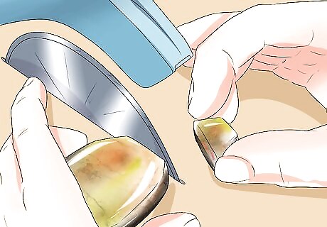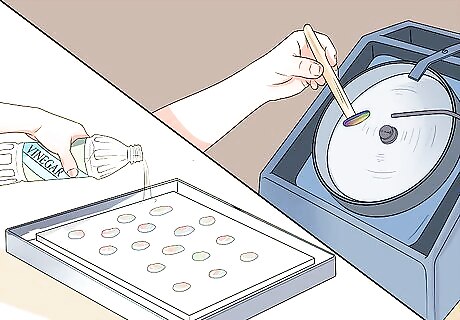 Remove flaws from your puddle cabochon pieces. Shelf primer might be stuck on the bottoms of puddle cabochons and vinegar is a great way to remove this. Soak the pieces for 20-30 minutes, shake them in their container gently, and remove the puddle cabochons from the vinegar. Shelf primer should easily rinse away after a soak. If it doesn’t, soak them again for a longer time until you notice the shelf primer is completely gone. Remove any devitrification with a sandblaster. If you don’t have any access to a sandblaster, light devitrification can removed from the tops of cabochon puddles with glass etching cream. Coat the puddles with cream for 30 minutes and then rinse them clean.