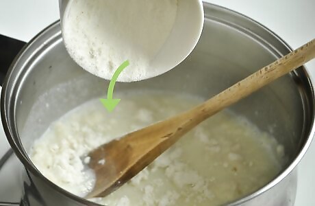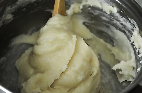 Add flour to the mixture. Remove the saucepan immediately and add one cup (236.6) of flour once the ingredients have been brought to a boil and melted,. Stir the mixture together until the mixture looks something like mash potatoes.