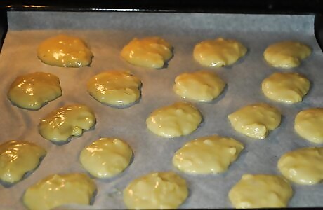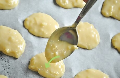 Use an ice cream scope to scoop the dough. You can use an ice scream scoop, two spoons, or piping bag with a round trip to form the balls of dough. Tablespoon-sized drops of dough are typical, but you can make the balls as big or as small as you want. Space the dough about an inch apart on the pan and press down any bumps to form smooth, round balls.