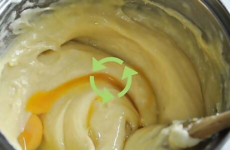 Add eggs to the mixture. Break the five, large eggs into the pan. Stir in between each egg added. Mix the eggs into the dough by hand with a stiff spatula, with a hand mixer, or with a stand mixer with a paddle attachment. The dough should turn into a smooth, creamy batter. Though the dough is smooth and creamy, it should still be thick enough to stand.