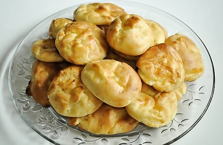 Allow the puffs to cool. Don't take the gougères out of the oven immediately. Turn the heat off when they are done baking and allow them to sit in the oven for about fifteen minutes so that the insides can dry out. After that, you can remove the pan(s) and allow them to cool for a few more minutes.